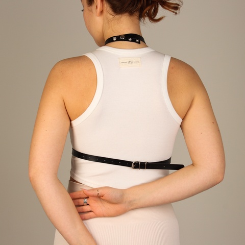 Портупея универсального размера подойдет каждой девушке, вне зависимости от особенностей фигуры. Портупея имеет черный цвет, благодаря чему очень ярко смотрится на теле.
