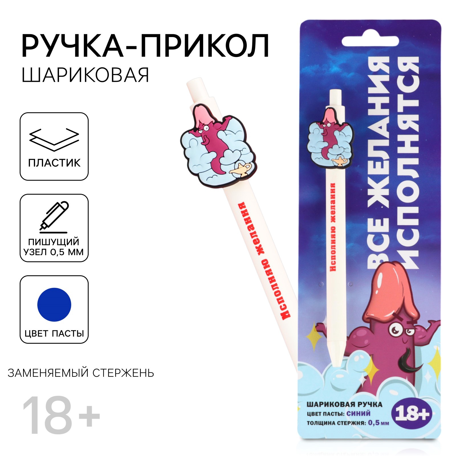 Ручка-прикол «Исполняю желания» — это забавная шариковая ручка с синей пастой, выполненная из прочного пластика.