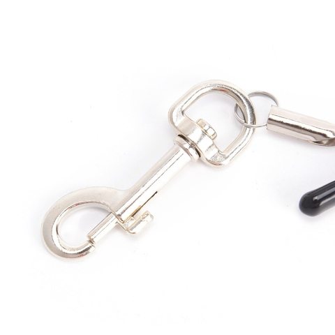 Зажимы для сосков, к которым крепятся карабины, плотно прижимают соски. Вы можете отрегулировать открытие зажимов с помощью ручки. Комплект очень экстравагантно смотрится на груди. Продукт для женщин и мужчин, которые хотят открыть для себя новые ощущения в эротике. К ним легко можно прикрепить поводок или наручники.